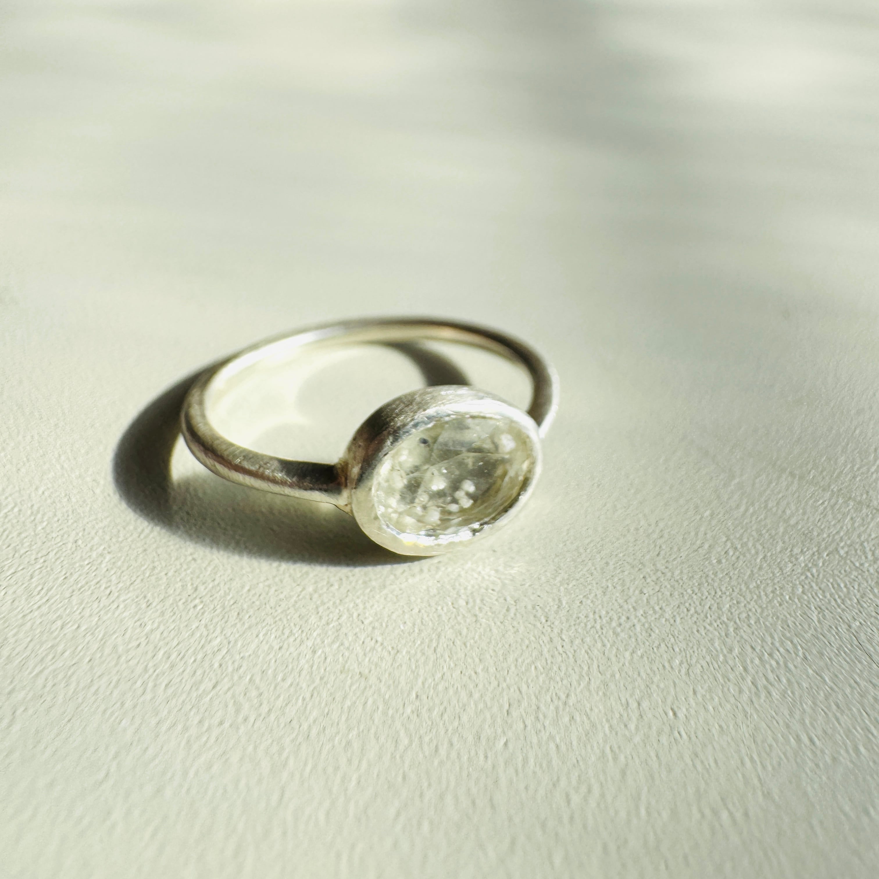 【Cristobalite in Libyan Glass】Desert snow 砂漠に舞い降りた雪のリング これは、約2900万年前に巨大な隕石の衝突という奇跡によってリビア砂漠に誕生した、天然のインパクトガラス、リビアングラスを使用したリングです 透明感のある淡い黄色の石を覗き込むと、内部には独特のインクルージョンが見られます 白い粒の正体は、超高温下で形成されるクリストバライト まるで灼熱の砂漠にひとひら舞い降りた雪のよう この石は表面の一部に小さな窪みがございます(写真矢印) 内包物の跡(キャビティやナチュラル)は欠けではなく、「個性」としてお楽しみ頂ければと思います。 リングはシルバー925を使用し全体をマットで仕上げました 落ち着いたテクスチャが、リビアングラスのほのかな黄みを上品に引き立てます 細身のデザインは、しっくりと指に馴染む軽やかさ、メインリングとしてはもちろん、他のリングと重ね付けを楽しむレイヤードスタイルにも最適です 石 クリストバライトインリビアングラス (Atelier Ruchiさんの石を使用) 素材 silver 925 サイズ 約7号 標本箱(桐製・オーガニック綿花入り)に入れてお届けいたします ネームプレートには 「CRISTOBALITE IN LIBYAN GLASS」 の表記がございます。 【こちらの作品はcreemaでも販売しております。ご注文が重複した場合は先着優先とさせていただきますので、ご注文をキャンセルさせていただく場合がございます。ご了承くださいませ。】