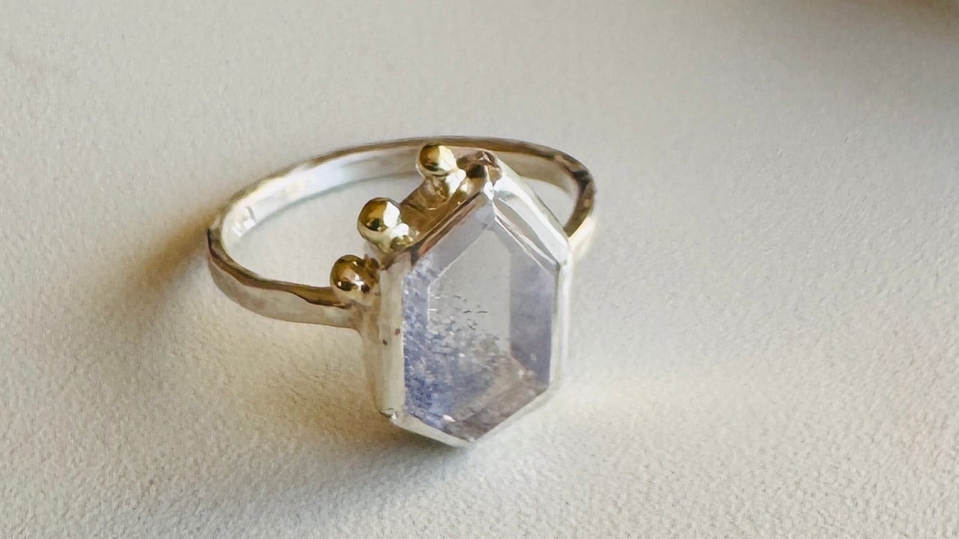 【Dumortierite in Quartz】Neige Bleue 「ネージュブルー」 silver 925/k10 リング デュモルチェライトインクォーツ silver 925 リング 透明度の高い水晶の中に、まるで青い花が咲き、静かに雪が舞い積もったかのような神秘的なインクルージョン Neige Bleue (ネージュ・ブルー)とはフランス語で「青い雪」、花吹雪のようなインクルージョンにちなんで付けました 内包の鉱物Dumortierite(デュモルチェライト)その名は19世紀のフランスの古生物学者、ユージン・デュモルティエ氏に由来します この石は彼により発見されましたが、透明な水晶に閉じ込められた「デュモルチェライト インクォーツ」としてその幻想的な姿が世界中に知れ渡ったのは2014年とごく最近のことです 知性とロマンを感じさせる歴史をまとい、時を越えて現れたように手元で静かに輝きます 石座の片側には、K10のゴールド粒を3粒添え、さりげなく華やかさをプラス クールなブルーとシルバーのトーンにゴールドのアクセントが加わることで温かみのある印象に 石:デュモルチェライトインクォーツ 素材:silver 925 /K10(粒) サイズ:約10号(サイズ変更不可) 標本箱(桐製・オーガニック綿花入り)に入れてお届けいたします。 ネームプレートには「DUMORTIERITE IN QUARTZ」の表記がございます。 【こちらの作品はcreemaでも販売しております。ご注文が重複した場合は先着優先とさせていただきますので、ご注文をキャンセルさせていただく場合がございます。ご了承くださいませ】
