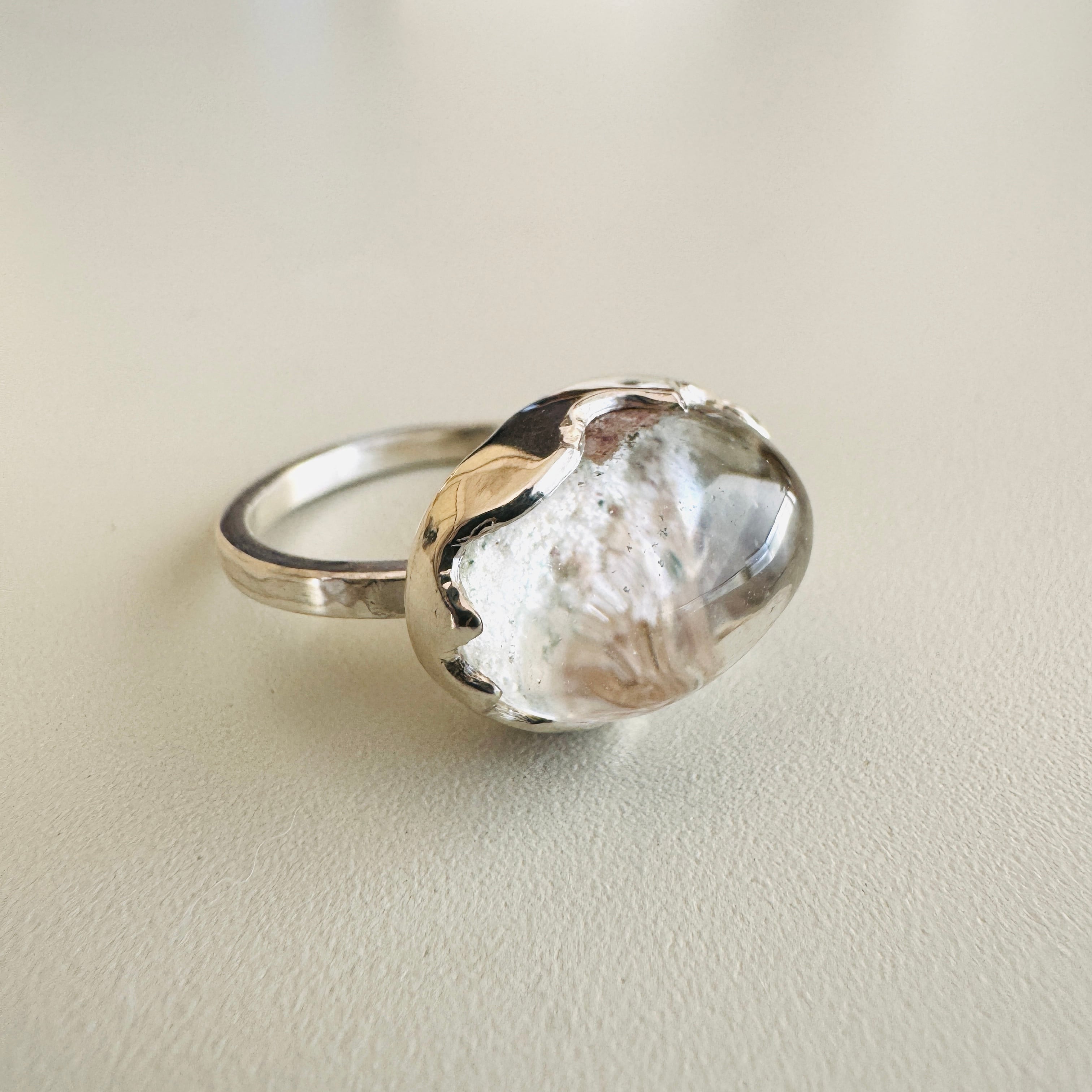 ぷっくりとしたホワイトガーデンクォーツを包むシルバーの石枠は