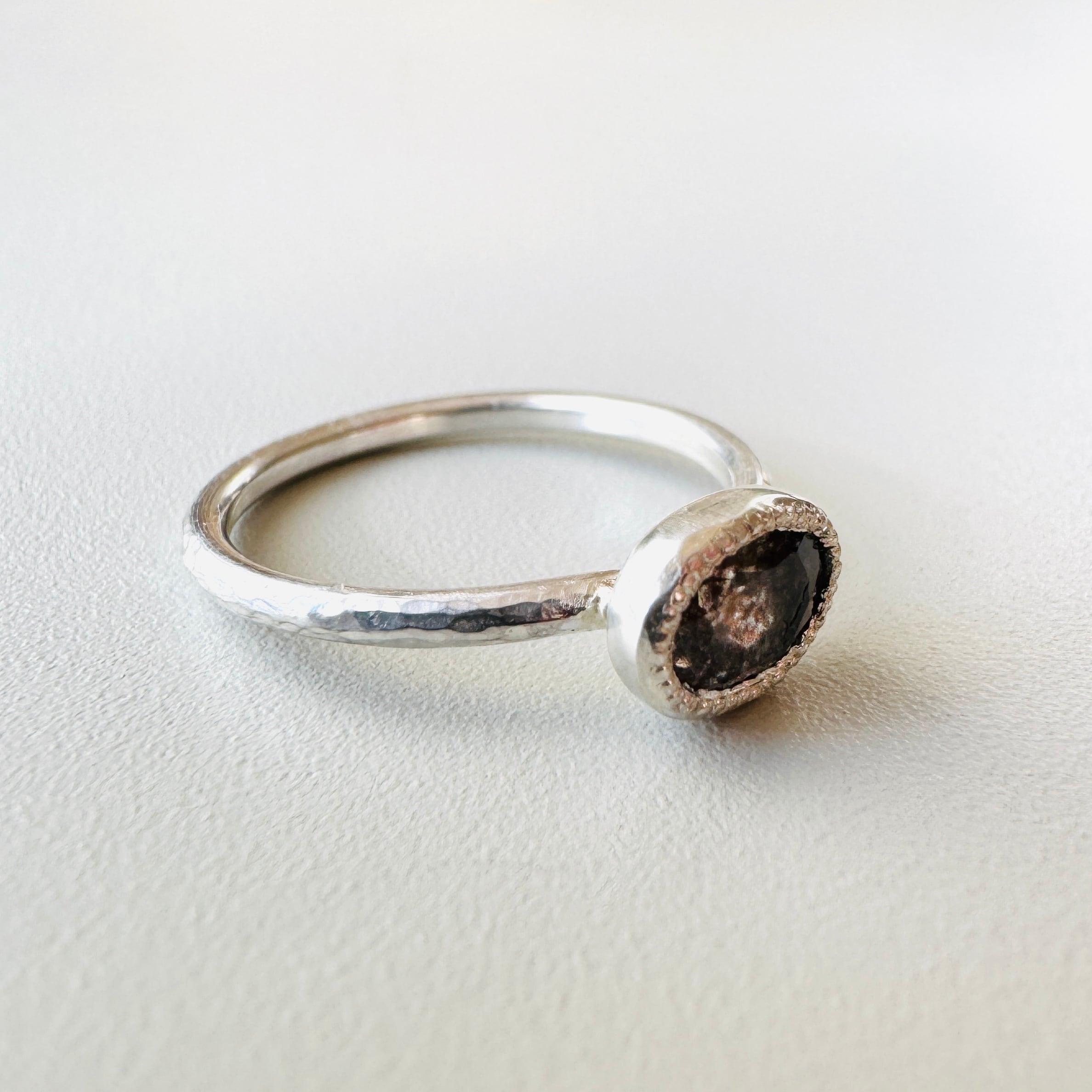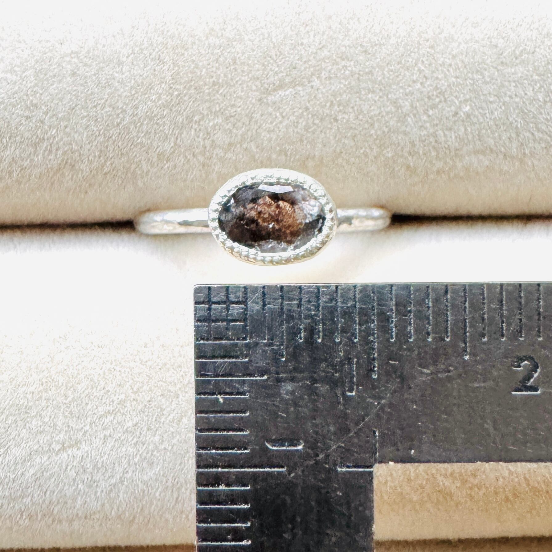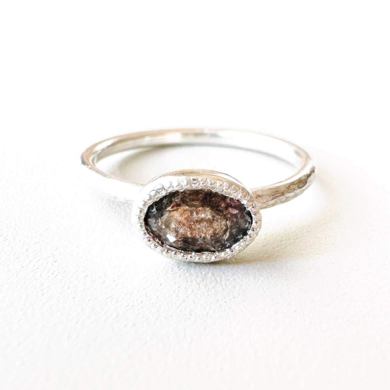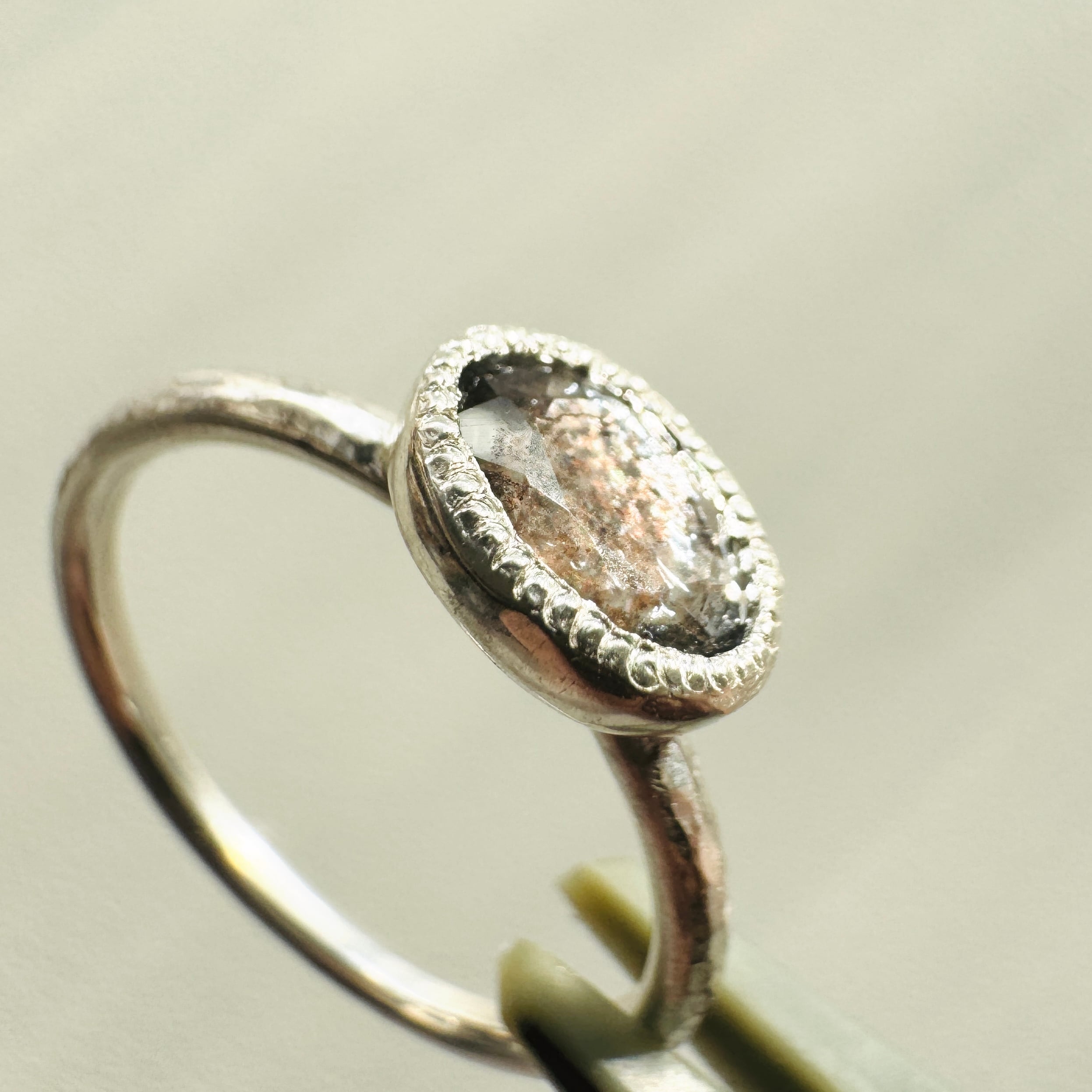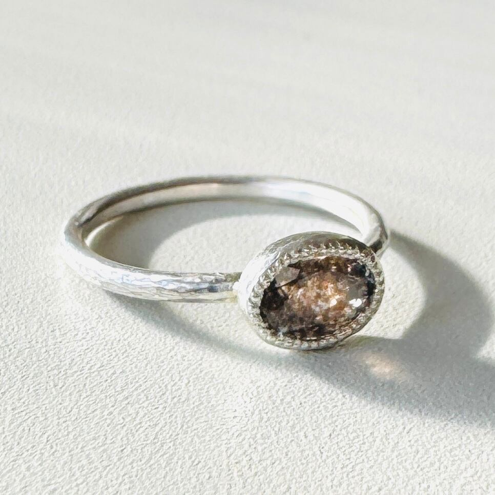 光の当たる角度を変えるたび、内包物がパチパチとはぜるように煌めきます