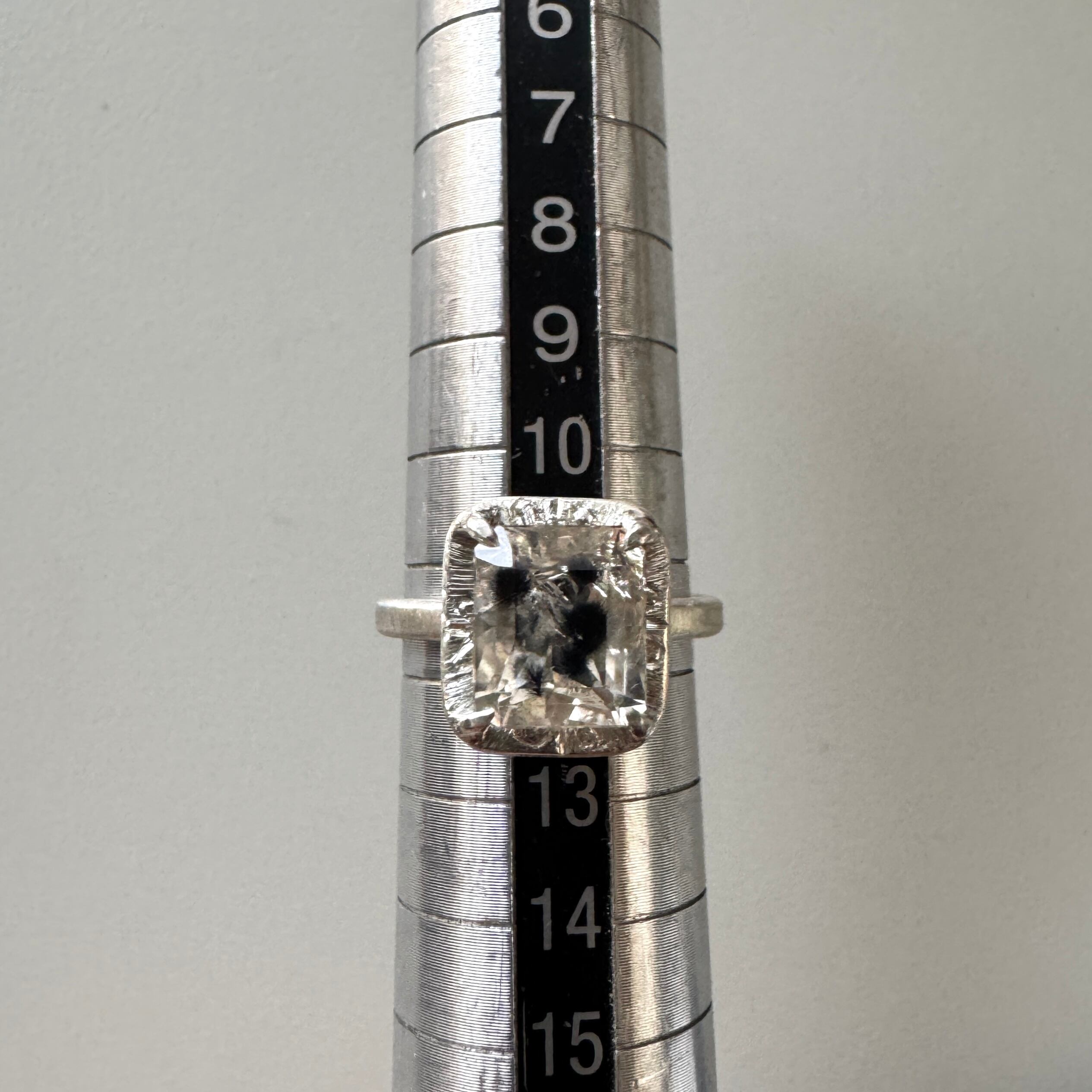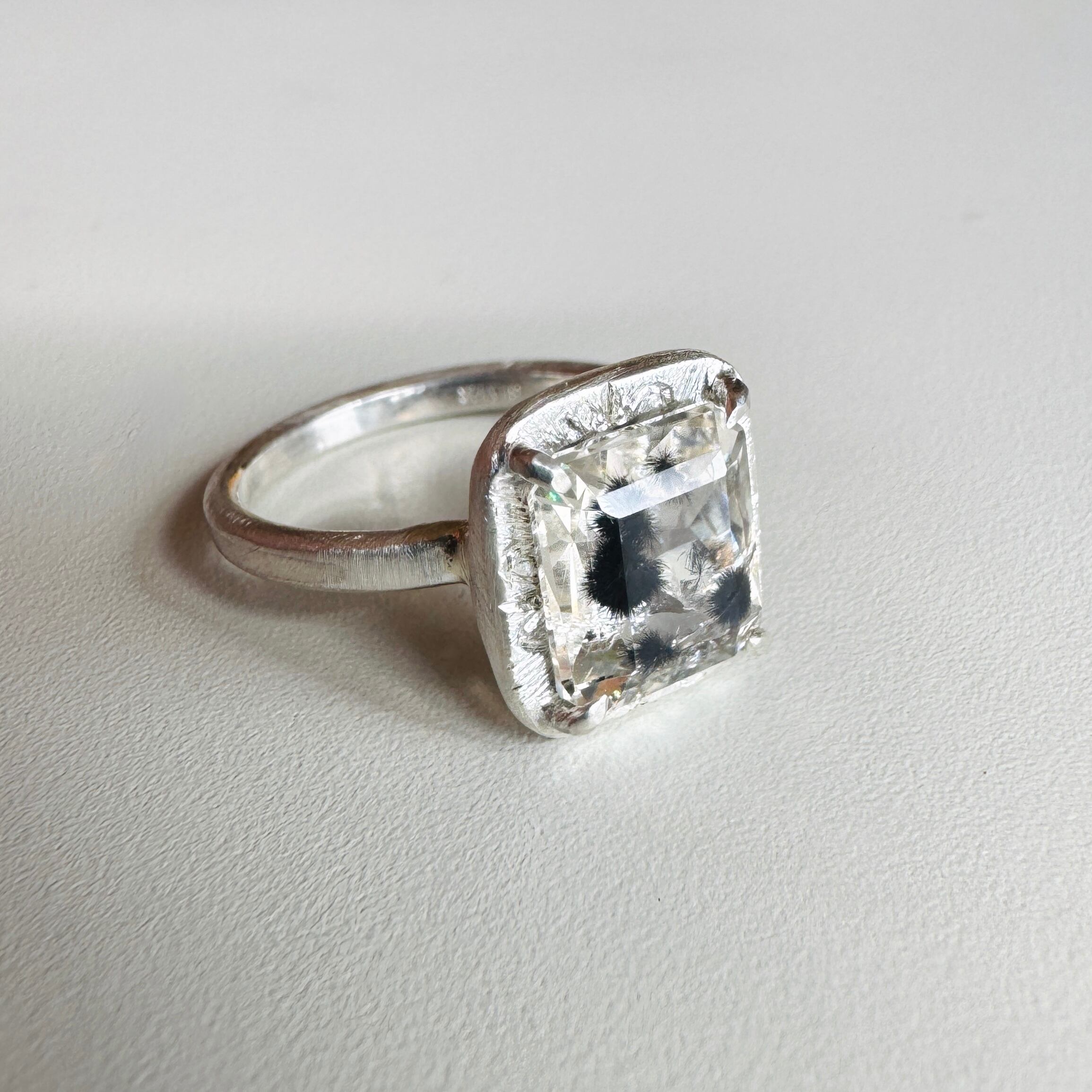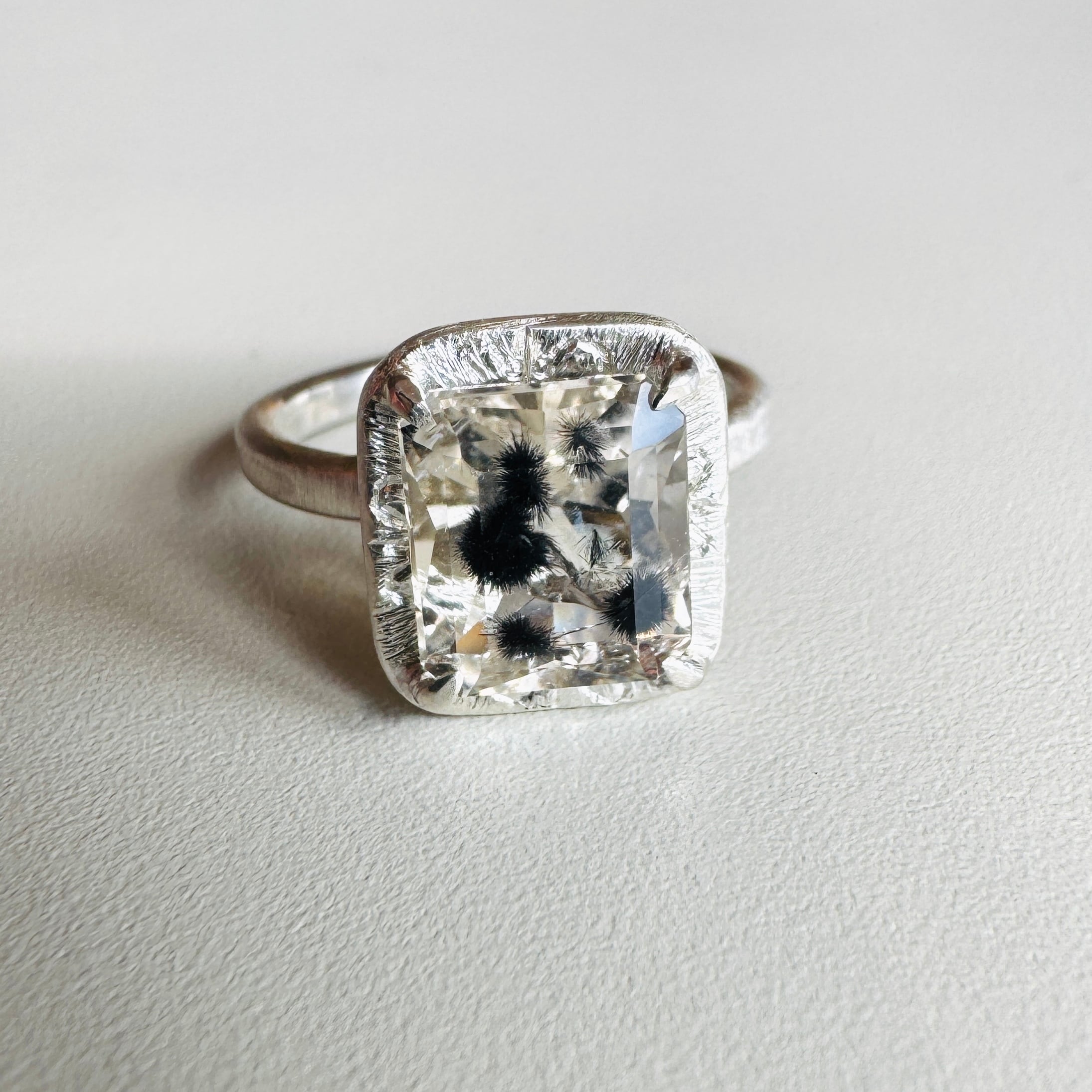 黄水晶の中に、まるで「黒いマリモ」のようなロマネサイトが閉じ込められたリング